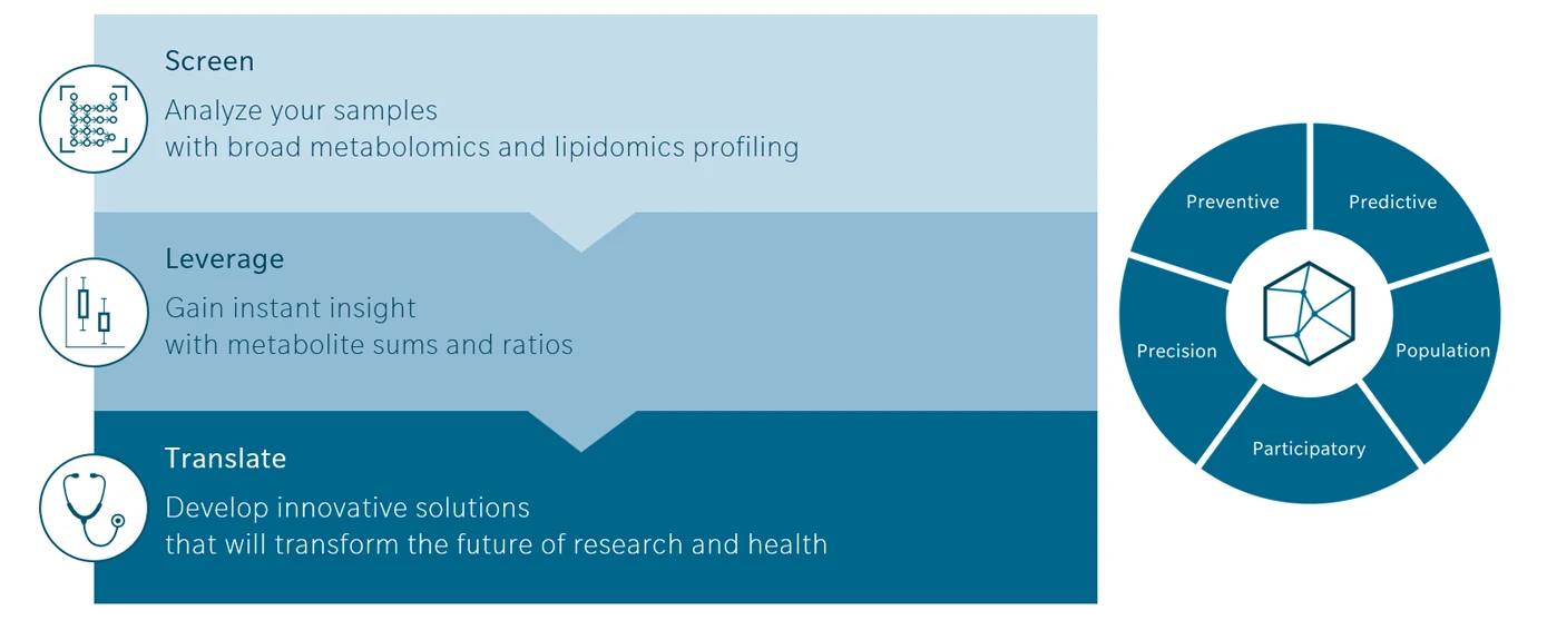 Applying metabolomics within the 5P framework can be summarized in three steps. First, screen samples using broad metabolomics and lipidomics profiling. Second, leverage data to uncover biological meaning. This involves interpreting metabolite patterns, sums, and ratios, and linking them to pathways and literature. Third, translate insights into solutions: providing predictive biomarkers, metabotypes, risk scores, and decision-support tools that transform medicine from reactive to proactive.