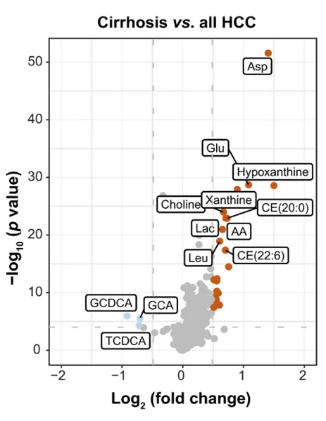 Across chronic liver disease, cirrhosis, initial HCC, and advanced HCC, amino acid-, lipid-, and nucleotide-related pathways were systematically deregulated, with aspartic acid, glutamic acid, taurine, and hypoxanthine emerging as key markers. In a phase II biomarker case-control study, a blood-based metabolite signature achieved an area under the curve (AUC) of 94% for distinguishing early-stage HCC from cirrhotic controls, with independent validation in an external cohort. Multiomics integration links these circulating markers to enzymatic nodes such as RRM2, GMPS, and BCAT1 – targets for precision oncology. By providing a validated, minimal-invasive liquid biopsy that outperforms current surveillance tools, serum metabolomics enables predictive identification of cancer risk, chemoprevention strategies, and personalized monitoring.